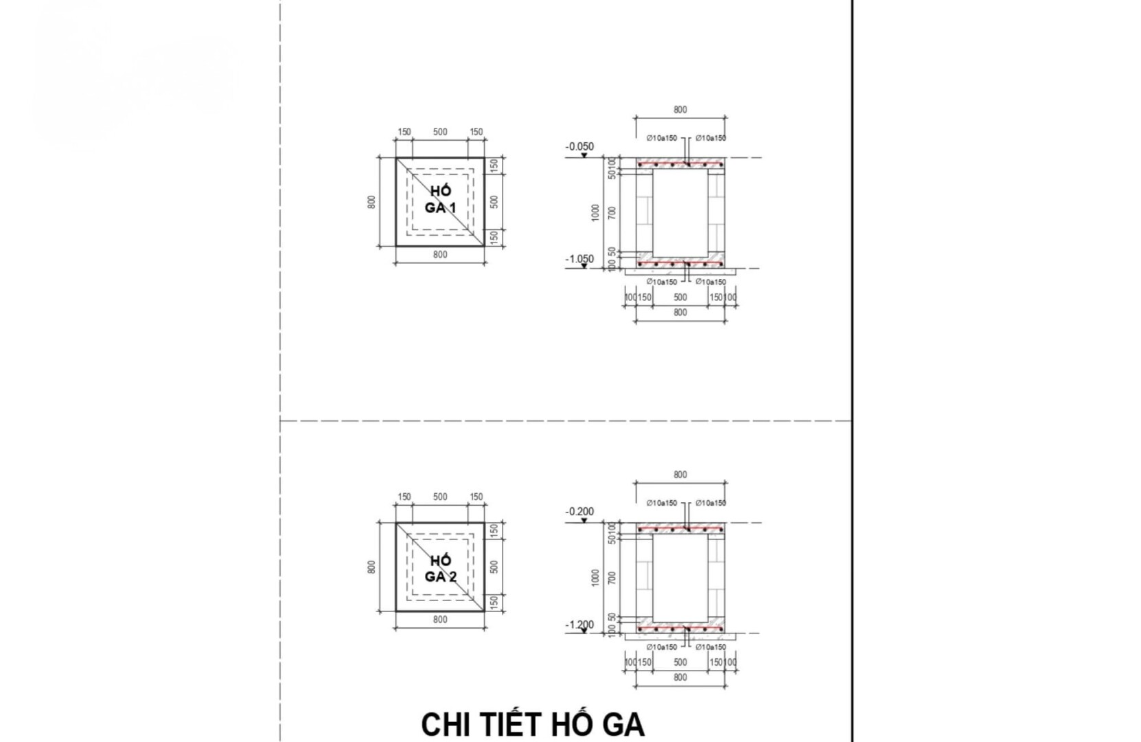 - Mặt bằng tổng thể: Thể hiện vị trí hố ga trong mạng lưới thoát nước, hướng dòng chảy nước mưa, cao độ các ống và mối liên kết giữa các hố ga; giúp kiểm soát toàn hệ thống và tránh giao cắt với hạ tầng ngầm (điện, viễn thông, cấp nước).