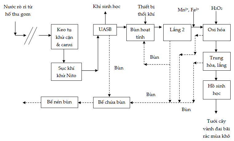 Nước rỉ rác sau đó từ hồ chứa sẽ được đưa vào bể trộn vôi nhằm loại bỏ màu nước và một số ion kim loại nặng. Bể này sẽ có bộ khuấy trộn vôi hoặc hệ thống sục khí. Để tránh việc lắng cặn vôi và nâng cao hiệu quả tăng độ pH, quá trình cung cấp vôi và sục khí sẽ được thực hiện một cách không liên tục.