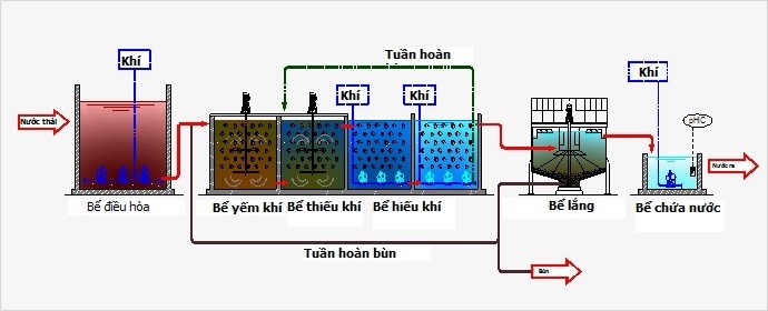 Quá trình hiếu khí sử dụng vi sinh vật trong điều kiện cung cấp đầy đủ khí oxy để loại bỏ các chất hữu cơ ô nhiễm thấp (COD<2000mg/l). Hệ thống máy thổi khí oxy giúp vi sinh vật hiếu khí sinh trưởng tốt và tiêu diệt chất hữu cơ trong nước thải. Vi sinh vật hiếu khí chuyển hóa các sản phẩm chứa photpho, nitơ và lưu huỳnh thành dạng PO4(3-), NO3-, SO4(2-) và vi sinh vật thiếu khí khử chúng. - Lọc