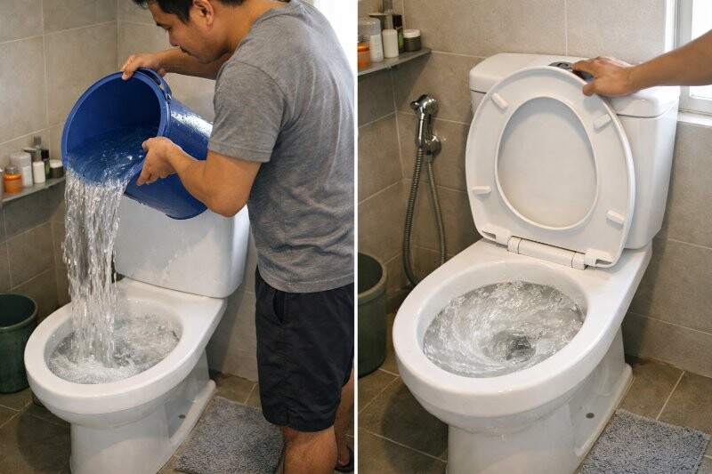 Đây là cách đơn giản nhất, không cần dụng cụ hỗ trợ. Cách làm này dễ thực hiện và phù hợp khi bồn cầu tắc nhẹ do chất thải tích tụ trong đường ống.